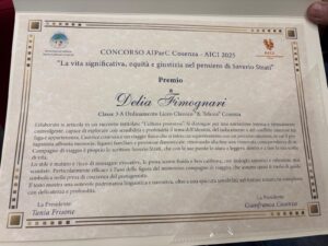 Il Liceo Classico “B. Telesio” di Cosenza si è distinto ancora una volta per l’eccellenza e l’impegno dei suoi studenti in ambito culturale. Giovedì 7 Novembre, presso l’Aula Magna del Liceo Scientifico “Scorza”, si è tenuta la solenne cerimonia di proclamazione dei vincitori e la consegna dei premi del Concorso Letterario “Per il centenario di Saverio Strati – La vita significativa, equità e giustizia nel pensiero di Saverio Strati”, organizzato dall’A.I.Par.C. (Associazione Italiana Parchi Culturali Cosenza). Il concorso, che ha coinvolto diversi Istituti di eccellenza del territorio, ha avuto l’obiettivo di far riflettere sulle opere di Saverio Strati, divulgare la conoscenza dell’autore calabrese e rafforzare la cittadinanza attiva tra i giovani.